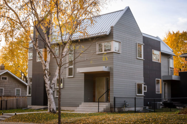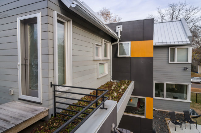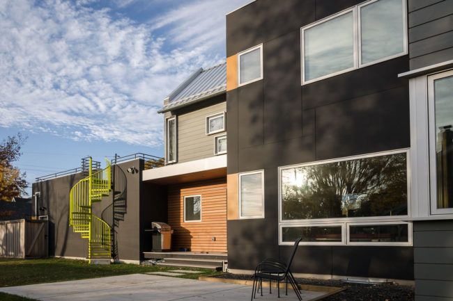 Located on a double lot in the Highland Park neighborhood of Saint Paul, MN, the owners wanted the house to be sensitive to the existing scale of the neighborhood while standing out as a new concept. The design solution was to break down the mass of the building into complimentary pieces: dark, flat-roofed boxes with a subtle, panelized cladding, and pitched-roof elements with stained cedar channel siding.