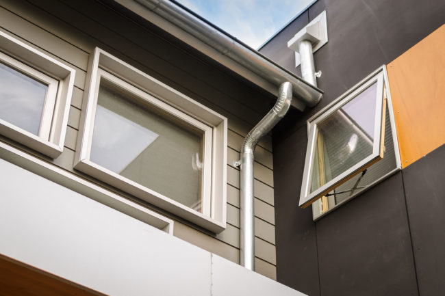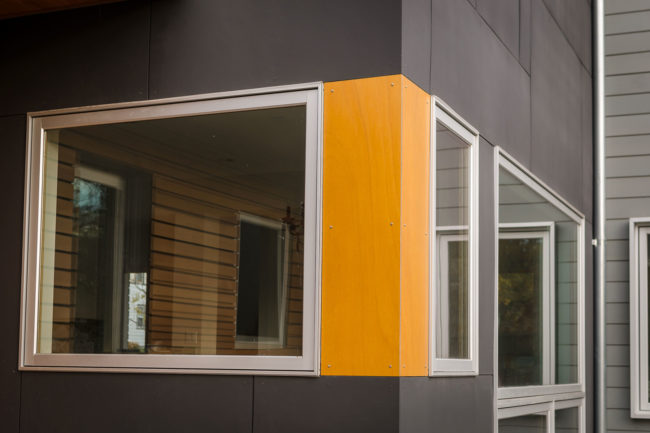 While the house is not large (2200 sf without the garage), it has a spacious feel with strong visual continuity and a phenomenal connection to the back yard. The modern interior features dark stained carbonized bamboo flooring, flush birch doors, recycled paper countertops, thermofoil cabinets and glass and steel tile.